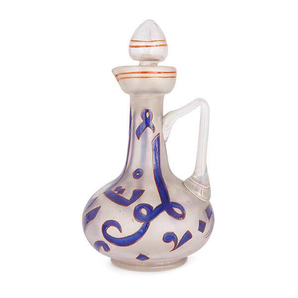 The delicate blue etching on this fine antique ewer is offset beautifully by the surrounding frosted glass, resulting in a wonderful visual contrast.