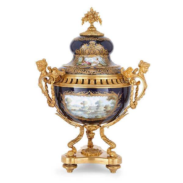 Of baluster form, decorated in blue with herons on a riverbank amidst bullrushes and trees, with a star cut base