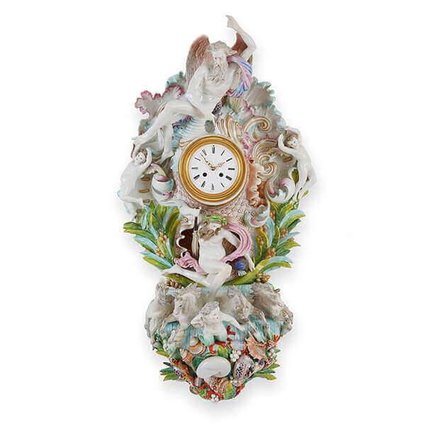 The central circular ormolu dial within an ormolu border and set in an elaborately detailed porcelain case with various mythological figural depictions, including Neptune and Chronos, as well as seahorses, shells and putti, with underglaze blue crossed sword marks.